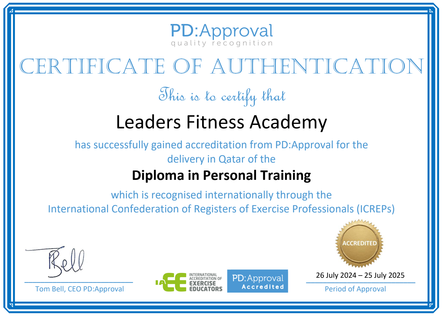 This is a foundation program that allows the students to have an in-depth understanding of the science behind the various concepts and components of health and fitness. The course is comprised of well-researched and up-to-date information that holds the key to unlocking a student’s potential of utilizing all the given tools in the most effective way for their clients to succeed in both physical and behavioral aspects. Our Diploma is Internationally recognized by AIEE and accredited by PD:Approval UK which will allow the learner to work as a world-class Personal Trainer.