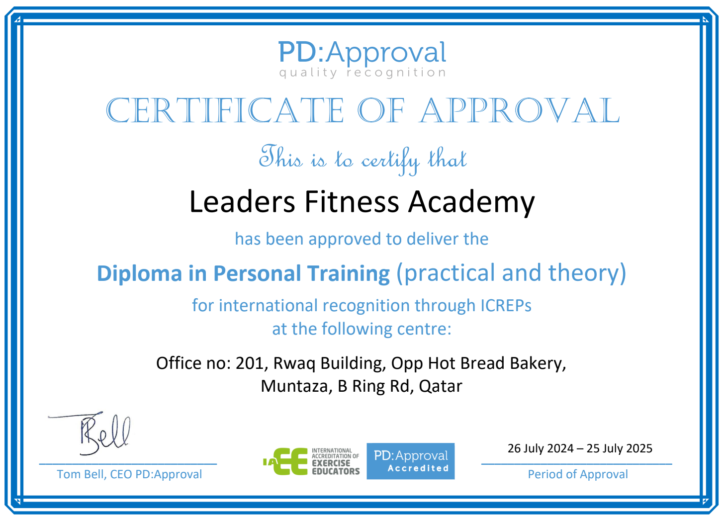 Leaders Fitness Academy is the one and only academy offering Diploma in Personal Training Certification which is internationally recognized by IAEE and accredited by PD:Approval UK. The Group offers an exclusive opportunity for all who are passionate to have a career in Health and Fitness, achieve their goals and become International Personal Trainer. Leaders Fitness Academy takes pride in having a state-of-the-art gym equipped with a training facility for both practical and theory classes for our students. Our courses are designed not only to provide students with up-to-date theoretical knowledge in the health and fitness industry but also to give them a chance to practically apply all the tools and information that they have gathered from the theory sessions.
